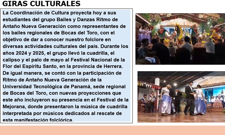 La Universidad Tecnológica de Panamá (UTP) en Bocas del Toro, a través del Departamento de Cultura, impulsa la creación de nuevos estudiantes interesados en promover diversas manifestaciones artística. Esto se logra mediante el desarrollo de actividades culturales que involucran a toda la familia universitaria, fortaleciendo asi no solo los conocimientos tecnologicos, sino tambien el desarrollo de habilidades artística en la juventud de la nueva generacion.