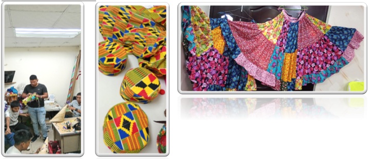 Los jóvenes confeccionan camisas y sombreros tradicionales a partir de corteza de palma de coco, decorados con piedras, espejos, cintas y materiales reciclados. Entre las piezas elaboradas destaca el sombrero Kufi, símbolo de identidad afrodescendientes.